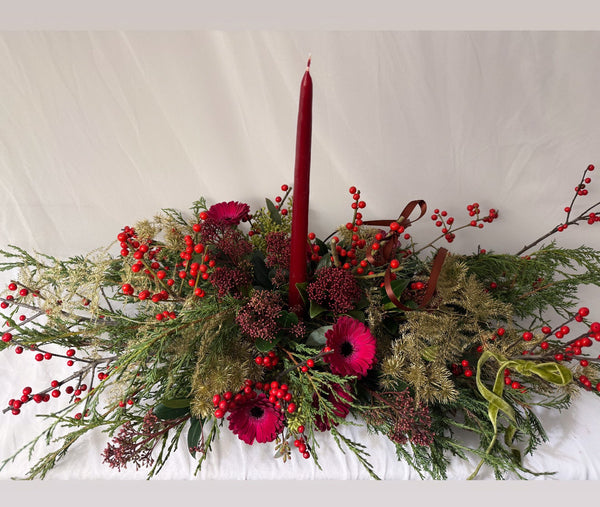 A festive and elegant Christmas centerpiece featuring a tall red or blue taper candles surrounded by lush seasonal greenery. Designed with fragrant evergreens, bright red berries, and glamorous metallic ornaments, this arrangement brings warmth and classic holiday charm to any table. Finished with natural textures and subtle ribbon accents, it’s perfect for Christmas dinners, holiday gatherings, or as a thoughtful seasonal gift.